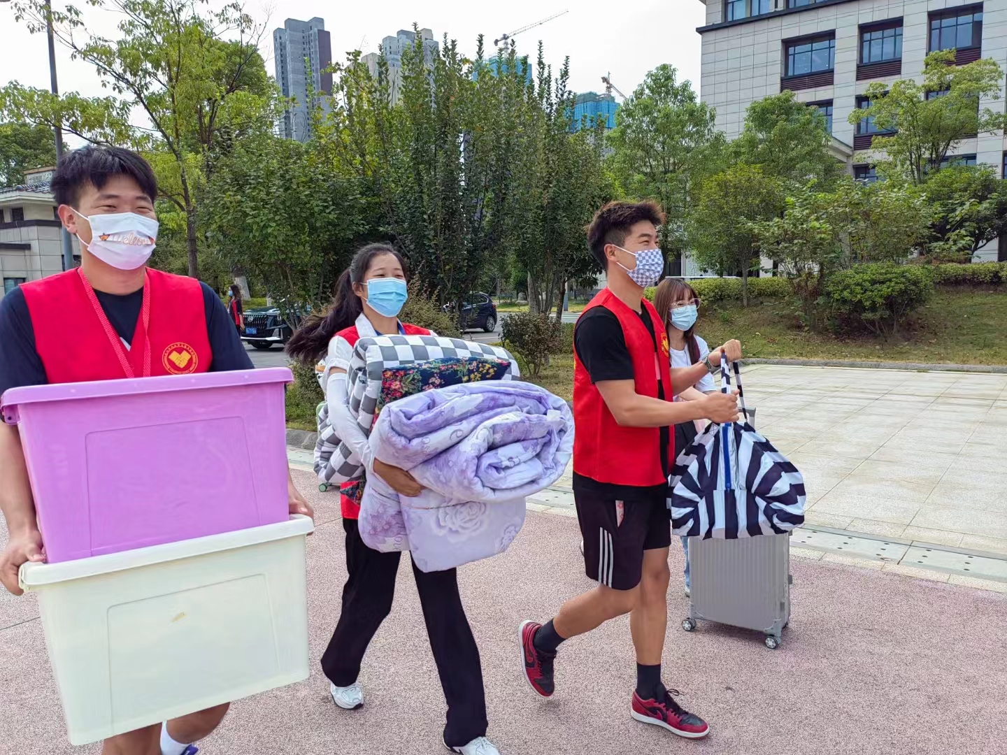 完成报到手续后,学长学姐们还陪同新生完成校园卡办理、缴费和领取军训服等一系列事情。最后志愿者们帮忙把新生的行李都搬运到学生宿舍时,“谢谢、谢谢”新生们的眼神里都流露出感激之情。
