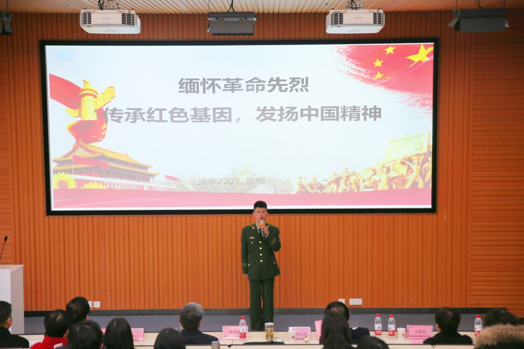 来自法学院的退伍士兵张程作为特邀嘉宾上台演讲。他身着军装,迈着坚定的步伐,行至舞台中央,抬手,敬军礼,精神抖擞的动作赢得了热烈而持久掌声。他以《缅怀革命先烈 传承红色基因 发扬中国精神》为主题,概述了革命先烈的奋斗史,表示要传承红色基因,发扬中国精神,为国家繁荣昌盛,为中华民族伟大复兴而贡献力量。