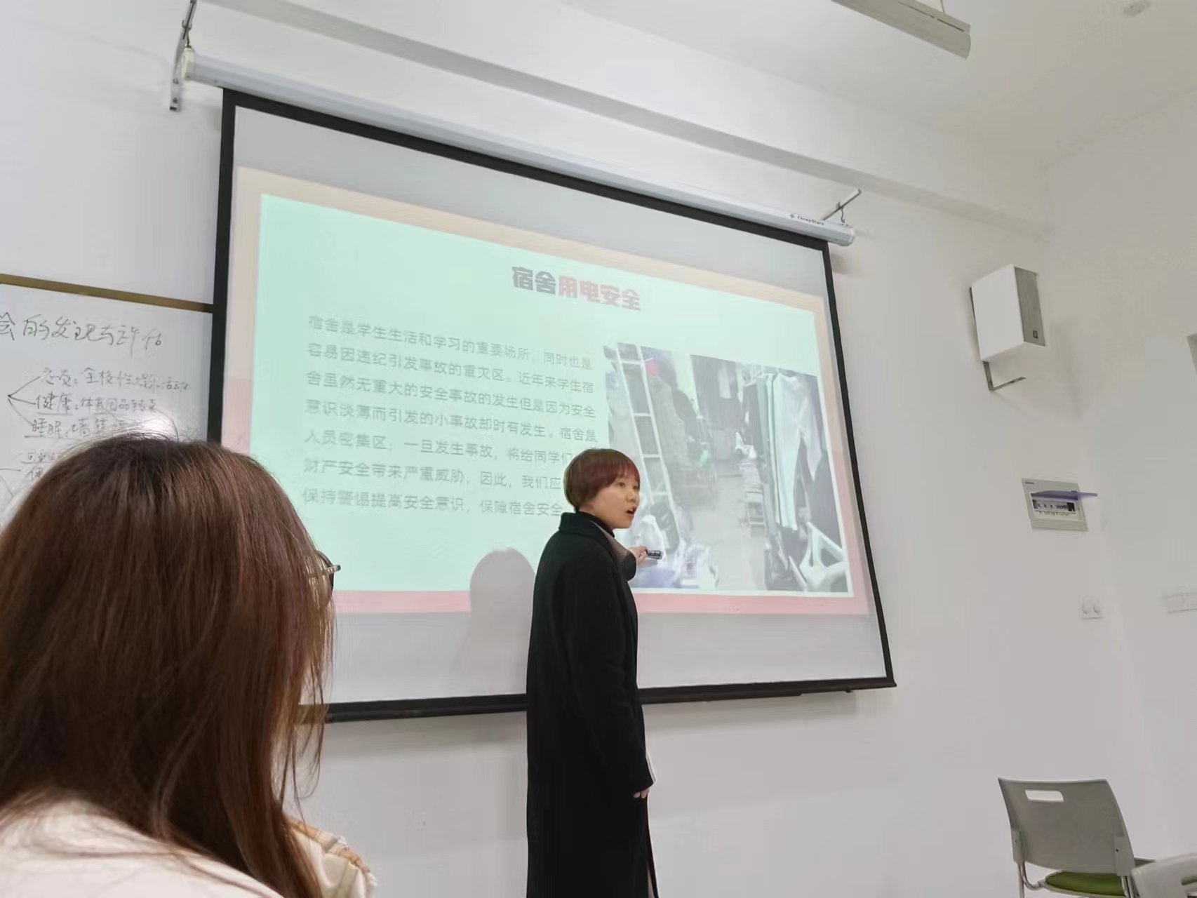 吴恩婵老师重点给宿舍长普及了用电安全的知识,不用大功率电器,不串联插座,防止漏电等,总而言之,宿舍用电安全,关乎着整个宿舍甚至整栋楼的安全。