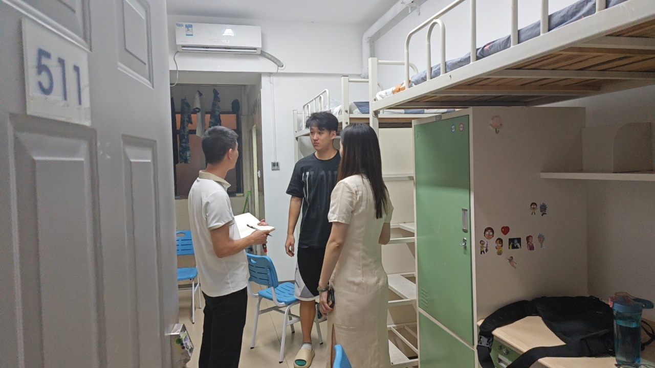 晚上辅导员第一次查寝,向新生们介绍了学校的发展历程、教学设施和校园文化,并希望大家能够珍惜大学时光,充分发扬勤奋、创新的精神。