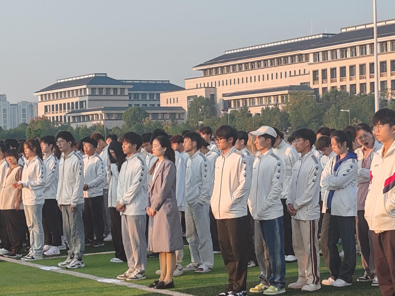 在朝阳的映照下,国旗护卫队的同学们迈着整齐划一、铿锵有力的步伐,护送着五星红旗走向旗杆。随着激昂的《义勇军进行曲》响起,师生们齐唱国歌,向国旗行注目礼。