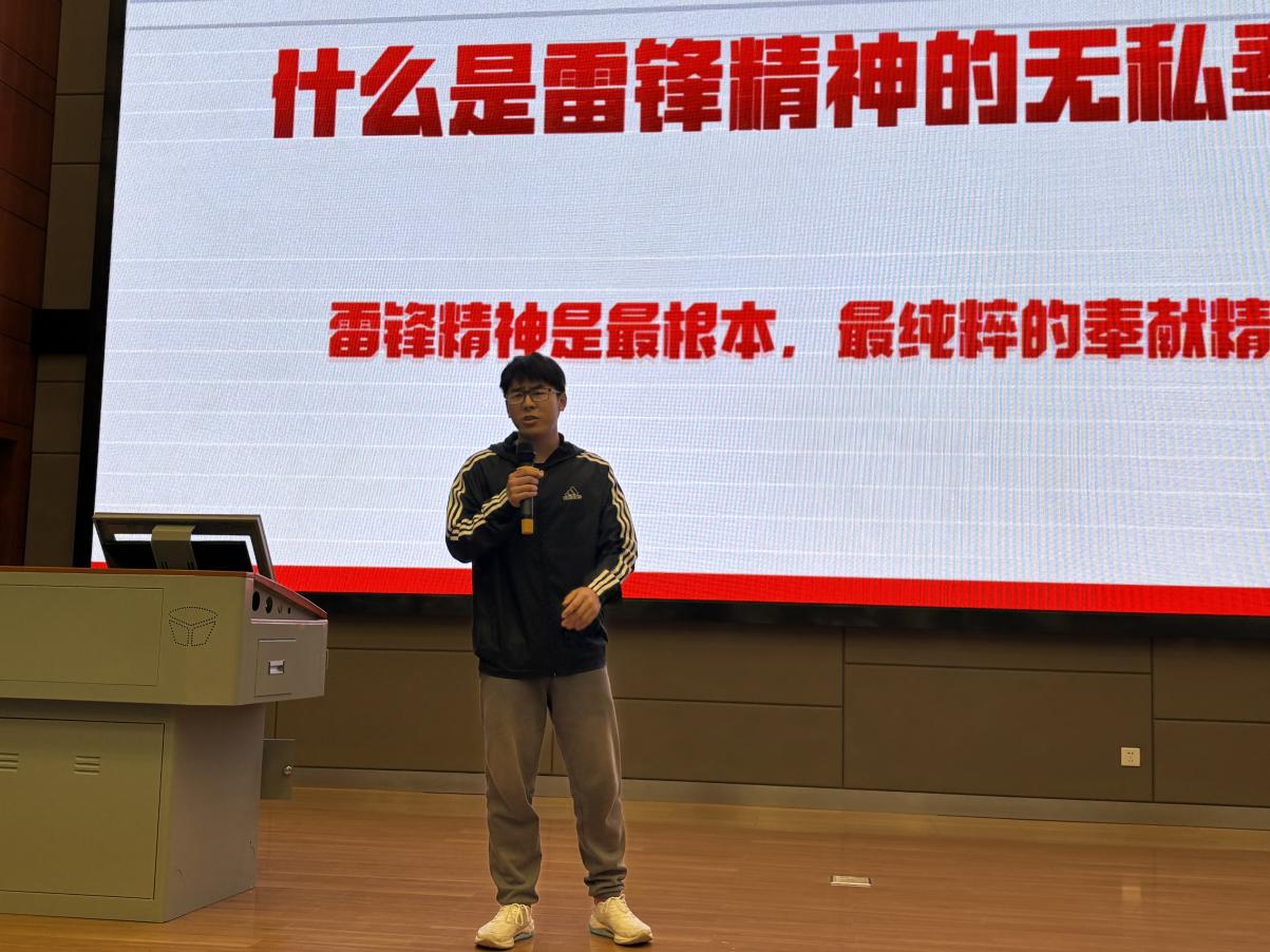 活动伊始,伴随着洪亮的国际歌,田园同学就雷锋无私奉献的精神进行宣讲,他从为什么要发扬雷锋精神,如何学习雷锋以及雷锋精神对我们当代青年的影响三个方面进行了具体的阐述,让我们深刻感受到雷锋精神不仅仅是一种行为准则,更是一种人生态度,一种精神追求。我们应该学习和传承雷锋精神,用自己的实际行动,践行为人民服务的宗旨,为党和人民的事业贡献自己的力量。