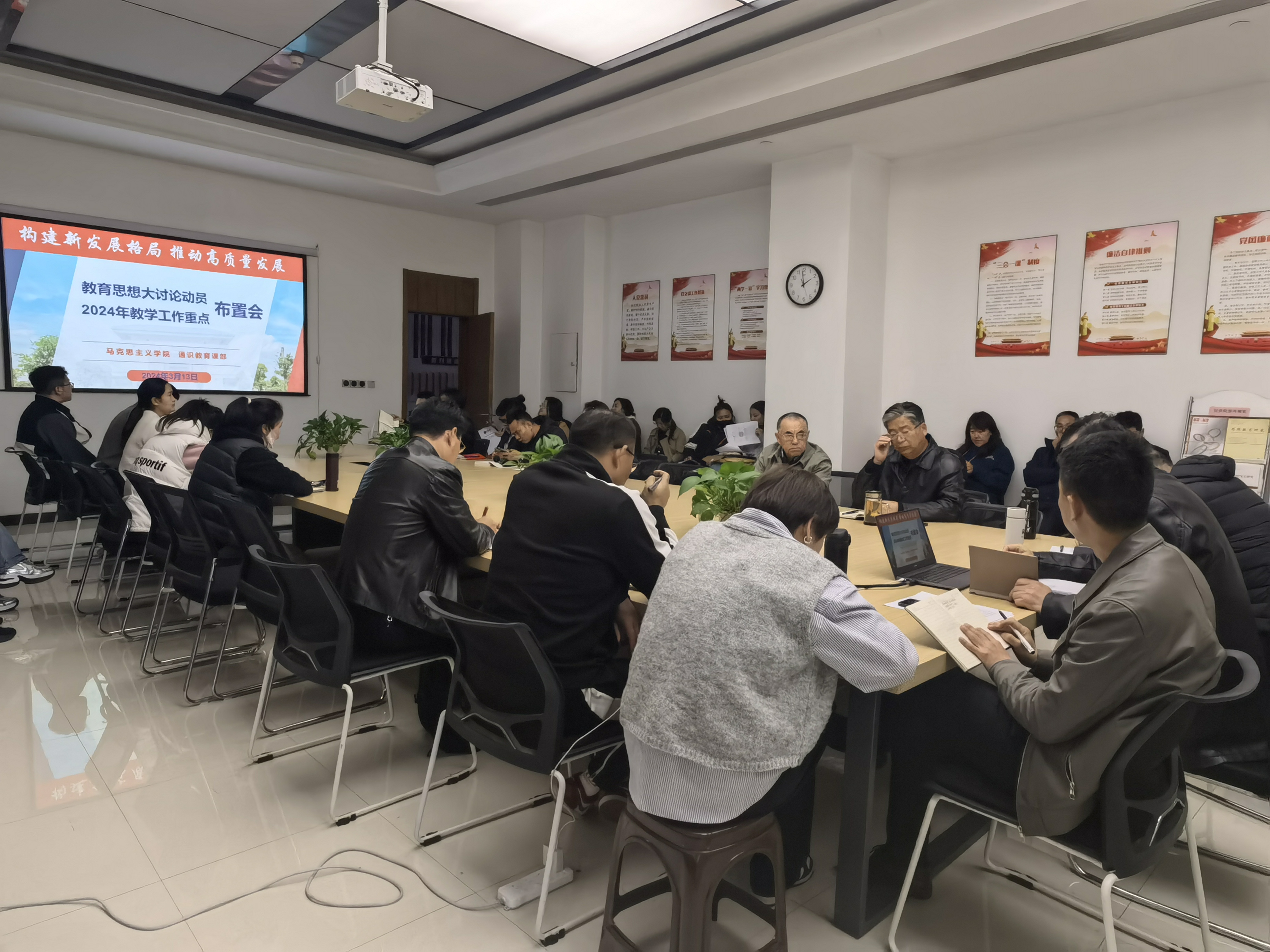 3月13日下午,马克思主义学院、通识教育课部在图书馆104会议室召开教育思想大讨论动员布置会和2024年教学工作重点布置会。会议由马克思主义学院院长、通识教育课部主任何捷一主持,马克思主义学院副院长、通识教育课部副主任王利军,通识教育课部副主任、马院通识党总支副书记魏成杰及全体教职员工参加。