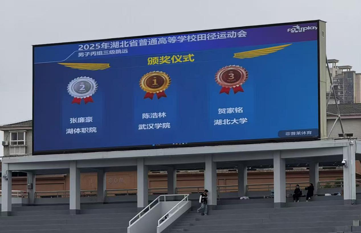 我校选手陈浩林凭借稳健的助跑节奏、卓越的踏板技术以及流畅的跳跃动作,最终以优异的成绩力压群雄,荣登最高领奖台。颁奖仪式现场,电子大屏清晰地展示着获奖名单。