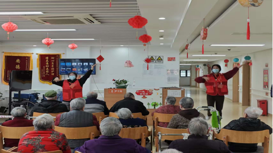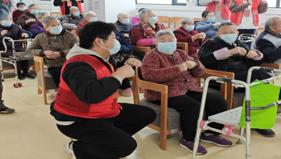 知识讲座结束后,为引导老人们进行适度运动,增强身体灵活性,志愿者们带领老人们做起了简单易学的手势操。志愿者们耐心示范每一个动作,手把手指导老人调整姿势,现场氛围温馨而热烈。随后,张楚悦、杜思盼两位志愿者为老人们表演了活力满满的健身操舞,整齐的动作、饱满的精神状态赢得了老人们的阵阵掌声,不少老人还跟着节奏轻轻晃动身体,脸上洋溢着开心的笑容。