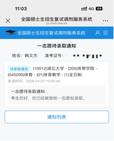 近日,2026 年全国硕士研究生招生录取工作喜讯频传,通识教育课部再添升学荣光。2022 级社会体育指导与管理专业(帆船特色班)学生韩文杰,凭借过硬的专业素养、坚韧的备考毅力与沉稳的复试表现,成功被湖北大学体育学院体育教学专业录取,圆满实现从武院到湖大的逐梦跨越。