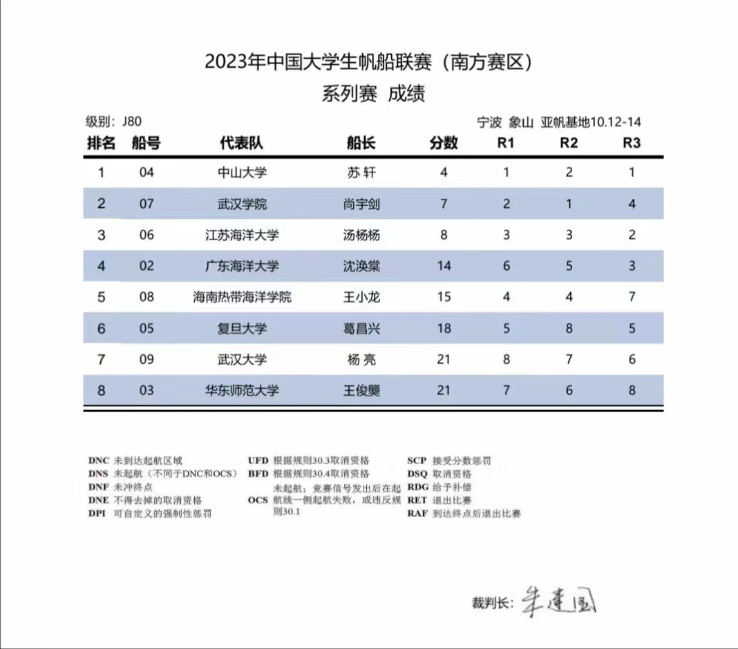 为期四天的首届中国大学生帆船联赛(南方赛区)于10月14日顺利完赛。本赛事由中国大学生体育协会主办,中国大学生体育协会海上运动分会执行。本次赛事吸引了包括复旦大学、武汉大学、中山大学、华东师范大学、江苏海洋大学在内的多所高校参加,众多大学生齐聚宁波象山亚帆中心,于海阔天空之中同场竞技,一较高下。此次赛事紧承亚运会帆船项目,与之同一场地,旨在以亚运会为契机,在大学生群体中推广帆船运动,普及航海文化,集聚更多青年才俊奔赴山海、共创未来。